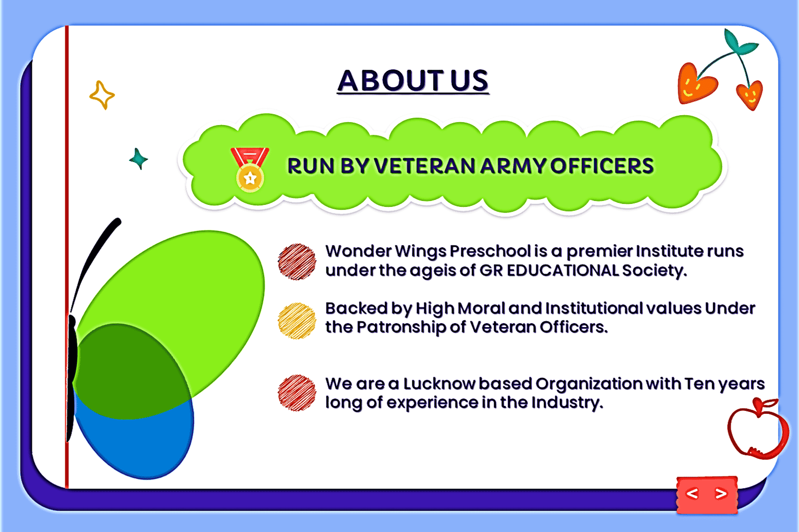 At Wonder Wings Preschool we believe that kids grow , learn and thrive by feeling safe , loved and nurtured . Our Goal is to provide an environment that engages toddlers with our specially designed ECCE pedagogy based activities and curriculum.